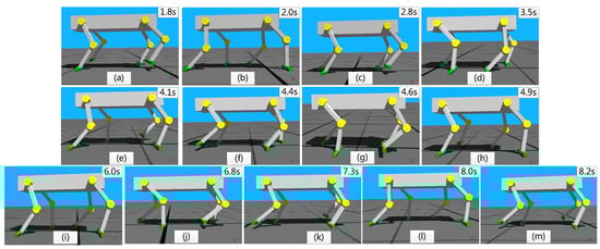 The simulation video capture, where (a) the typical trot gait; (b) starting the transition from trot to walk gait; (c) the gait transition process; (d) transition finished; (e), (f), (g) and (h) the typical walk gait, robot’s leg lift sequence is 1-3-2-4; (i) starting the transition from walk to trot gait; (j) and (k) the gait transition process; (l) transition finished; (m) the typical trot gait.