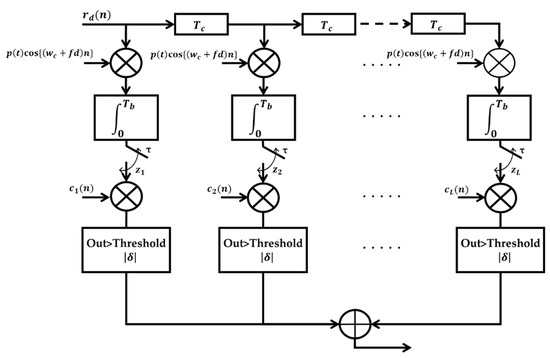 Various studies have been actively underway on underwater acoustic communication with a low probability of interception (LPI) to promote reliable communication [1,2,3]. The covert underwater acoustic communication system satisfies both the LPI characteristic, in which the transmitted signal is not intercepted by receivers other than the intended receiver, and the low probability of detection (LPD) characteristic, which reduces the probability of being detected by transmitting signals at a low signal to noise ratio (SNR) below the surrounding background noise in order to maintain covertness. A number of methods have been proposed, and the most well-known communication method is a spread spectrum communication technique [4,5]. The typical methods used in the spread spectrum communication technique are direct sequence spread spectrum (DSSS) and frequency-hopping spread spectrum (FHSS). In this paper, a direct sequence spread spectrum that ensures covertness is applied by multiplying the pseudo noise (PN) code sequence that has P chips by the transmission signals to be transmitted. The spread spectrum technique can obtain diffusion gain in the multi-sensor communication and a frequency diversity effect in underwater acoustic communication, where selective frequency fading occurs even when data transmission efficiency is sacrificed [6].