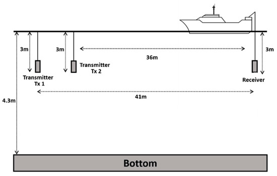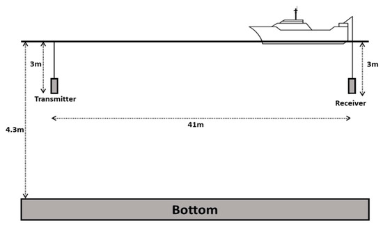 The actual underwater experiment was conducted to analyze the performance of the multi-sensor covert underwater communication. The underwater experiment was conducted in September 2016 at the coastal waters near Korea Maritime and Ocean University located in Yeongdo-gu, Busan. The experimental environment and schematic diagram are presented in Table 3 and Figure 5. The signal is transmitted 10 times iteratively by placing a delay between data packets.