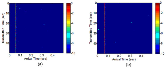 The number of actual underwater data bits was set to 500 bits, the number of transmitters was set to two, the number of sensors was two, distance to transmitter and receiver was 41 m and 36 m, distance between transmitters was 5 m, and depth of the transceiver was set to 3 m from the surface of the water. The response characteristics of each channel are shown in Figure 6.