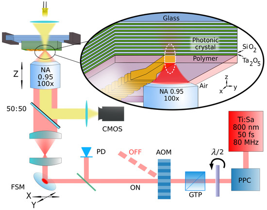 We used a custom 2PP setup for polymer film nanostructuring (Figure 1). Radiation from the source (Ti:Sa femtosecond laser, 800 nm, 80 MHz repetition rate, 50 fs pulse duration) passed through a pulse precompressor (PPC) to compensate for positive dispersion introduced by optical elements. A system of a halfwave plate/2 in a rotational motorized stage, a Glan–Taylor prism (GTP) and a photodiode (PD) controlled the average power of incident radiation with the accuracy of 0.1 mW. Acoustooptical modulator (AOM) served as a fast shutter. The fast steering mirror (FSM) provided the beam waist movement within the sample plane () with the accuracy of 1 nm in the field of 60 m × 60 m and a piezoelectric stage moved the laser beam waist in a perpendicular direction (Z) with the accuracy of 5 nm in the travel range of 200 m. The laser beam was tightly focused by an air objective (100×, numerical aperture (NA) = 0.95). The sample was mounted in an upside-down position on a motorized microscopic table because the photonic crystal is not transparent for incident radiation. The experimental setup was completely automatic. The polymerisation process was visualized and controlled by a CMOS camera DCC1545M (Thorlabs Inc, Newton, New Jersey, USA).