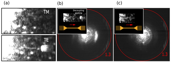(a) Direct plane image of the fabricated device for transverse electric- (TE-) and transverse magnetic- (TM-) polarisations of incident light. A grating-shaped spot on the right corresponds to the radiation, which was coupled to waveguide modes and subsequently radiated into the far field by decoupling grating; (b,c) back focal plane (BFP) and direct plane images of sample 4 with open (b) and closed (c) decoupling grating. Red circle defines numerical aperture (NA) = 1.3 of collecting objective.