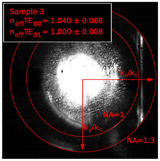 Using the BFP images, the effective refractive indices of BSW waveguide modes can be determined. Figure 5 depicts the BFP image of sample 3 and the circles defined the numerical aperture of the collecting objective and the light cone. The waveguide of the sample 3 supports only two BSW-modes. From the known NA = 1.3 of the objective and the position of the intersecting point of the X-axis and every stripe, the effective refractive index for distinctive modes may be calculated as . Stripe width defines the experimental error. We attributed the mode with the largest effective refractive index to TE mode, and the second mode to TE mode. The obtained effective refractive index values are presented in Figure 5.