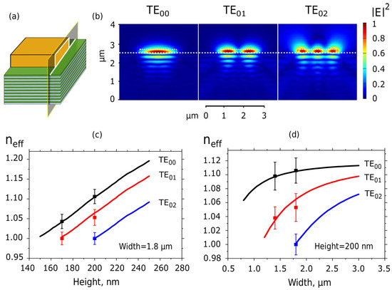 (a) A schematic view of a model waveguide with a marked cross-section; (b) Electric field distribution in a waveguide cross-section for different modes, sustained by a model waveguide, whose size corresponds to sample 1; (c) The dependence of effective refractive index on waveguide height for different modes. The width of the waveguide is 1400 nm. Experiment—dots, theory—solid lines; (d) The dependence of effective refractive index on waveguide width for different modes. The height of the waveguide is 200 nm. Experiment—dots, theory—solid lines.