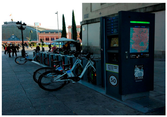 All bike sharing systems operate on the basis of a common philosophy, their principle is simple: individuals use bicycles on an “as-needed” basis without the costs and responsibilities that owning a bicycle normally entails [9]. Figure 1 shows a classical bike station, where there are free docks and available bikes to rent within a station map of Madrid’s Bike Sharing System called BiciMad. As shown on the map, the bike sharing system offers a wide list of stations located across the centre of the city.