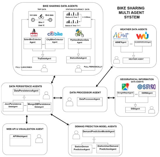 This section details the proposed multi agent system (MAS) and presents a general diagram of the system’s architecture which is shown in Figure 2. Literature shows that multi agent systems have previously been employed in similar tasks like taxi fleet coordination [32] where they offer an ideal solution to abstract away issues of the different existing platforms and communication protocols. The system is divided into the following groups of agents: bike sharing data agents, weather data collector agents, geographical information agents, data persistence agents, demand prediction agents and API agents. Several multi agent platforms such as SPADE [33,34], JADE [35], PANGEA [36,37], AIOMAS [38] and osBrain [39] were evaluated and osBrain was finally selected for this system because of its ease of use. Furthermore, it is implemented in Python (like SPADE and AIOMAS) and it is in continuous development nowadays.