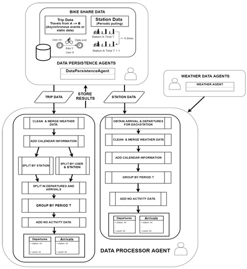 Since different kinds of information are obtained by the bike sharing data agents, the data processor agent is capable of perform two different data processing workflows. The selected workflow will depend on the type of input information: trip data information or station data information. As it has been pointed out previously, the output data obtained by processing either kind of input information will be different and will be employed differently depending on the case study.
