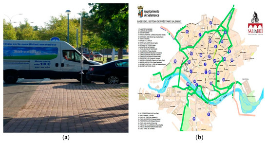 (a) One of the trucks of the SalenBici system operators; (b) Map of the stations provided by the council of Salamanca.