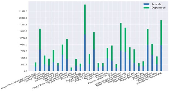 Figure 6 shows the total number of trips loaded in the system, which are divided into arrivals and departures for each of the stations in the system. This data dates from January 2013 until March 2017 a total of 1520 days and we can see a clear difference between the use of stations in the system. There are a lot of stations where the mean of the bike trips is less than 2 events (arrivals or departures) per day. The station with the highest mean is called “Plaza Poeta Iglesias” near Plaza Mayor (the most touristic place in the city of Salamanca), with 15 events per day (arrivals or departures).