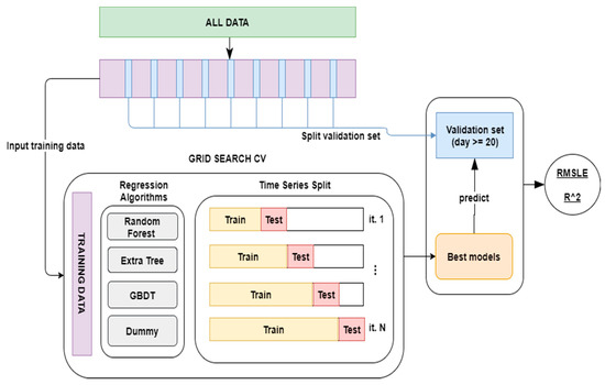 This section describes how the BSS dataset was split and the methodology that was used in order to select the prediction models that will be included in the predictor agent. Like in Kaggle competitions [17], the data have been split into two datasets; a training dataset and a validation dataset. Figure 8 shows schematically how the available data were employed in the training, selection and validation of the models used. In the upper part of the figure, the green part represents the entire dataset. Like in Kaggle competition, a validation dataset is initially extracted and it is formed from the 20th to the end of each month, in the diagram it is represented in blue. The rest of the dataset, (those from the 1st to the 19th of each month), will be used as training data, represented in violet in the diagram. These data will be one of the inputs of the hyperparameter search technique: GridSearchCV [50]. This technique will use the following as inputs: (1) regression algorithms with their corresponding parameter grid; (2) a scoring function, in order to evaluate the input models, in this case RMSLE and R2; finally; (3) a cross validation method, in this case TimeSeriesSplit, a method that is intended specifically for time series and which resembles the usual functioning of a system in production. This method makes it possible to progressively use data from the past for training and use future data for validation, a diagram showing its functioning is situated in the lower part under GridSearchCV, in Figure 8.