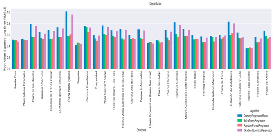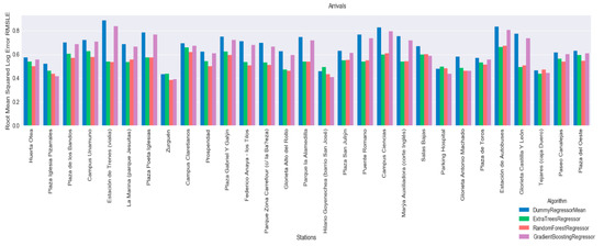 Next, the results of the RMSLE validation dataset are outlined. The results of the best models selected by the GridSearchCV for each station, are described. Figure 9 shows the results for arrivals and Figure 10 shows results for departures. From these graphs, we can see that regressors tend to have better results than the established baseline. The Random Forest Regressor and the Extra Tree Regressor have the best results.
