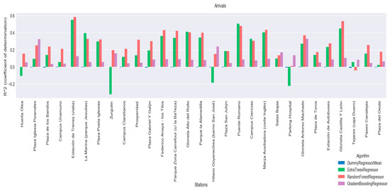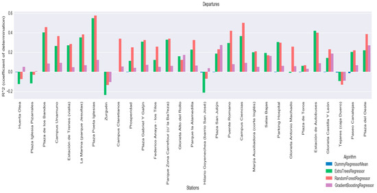 Additionally, the coefficient of determination R2 has been calculated for each of the algorithms, with the aim of using it to select a model that will be included in the predictor agent. The results of the coefficient of determination are shown for each of the algorithms at each of the stations, for arrivals in Figure 11 and departures in Figure 12. Graphically, that the method that performs the best with R2 is Random Forest Regressor, however results will be analysed to see if this difference is significant.