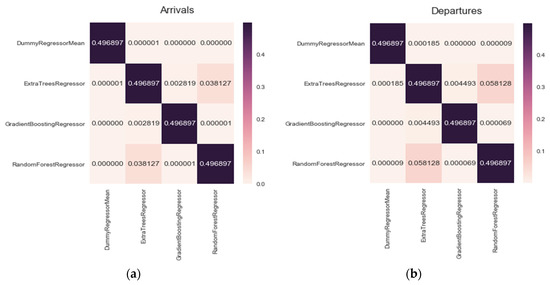 In order to select the best algorithm for all the stations in the system, a statistical Mann-Whitney U test was used. First, the test was done in order to check if one of the algorithms used, functions differently to the rest. The following confirmatory data analysis was applied: considers the median of two equal methods while considers the median of two different methods. As we can see in Figure 13, in the case of both departure and arrival models, the Random Forest Regressor Algorithm has a median that is different to the rest, thus, it could be considered that there is a significant statistical difference. The p-value obtained for the Random Forest Regressor and Extra Tree pair, surpasses slightly the test’s 0.05 significance level, thus it cannot be assumed that there is a significant statistical difference. However, by calculating the median of both methods we can see that the median for Random Forest Regressor is greater in comparison to that of ExtraTreesRegressor.