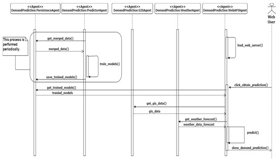 After seeing these results, Random Forest Regressor has been selected for inclusion in the predictor agent; it will generate models and store them to subsequently provide predictions through the WebAPI agent. In Figure 15, the sequence diagram for performing the predictions is shown. The predictor agent periodically trains and saves the model for each station in the system. Later these models are used by the WebAPI agent in order to show predictions on the web application and the API REST.