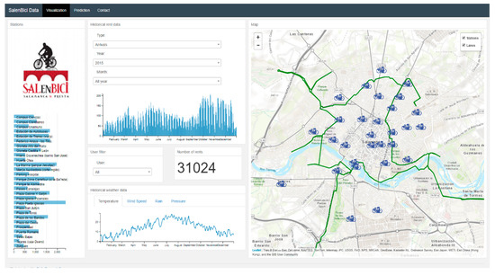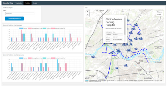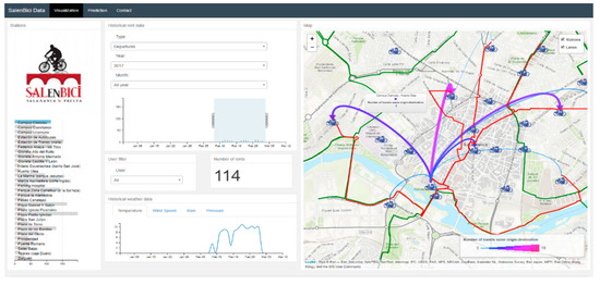 Trips between the station of origin and the rest of stations are represented with arrows, whose colour and width is proportional to the number of rides made between a particular station and the rest. These visualizations allow the BSS administrator to analyse the history of the system and find the stations with the greatest numbers of arrivals and departures. Figure 18 shows the demand prediction section which employs the selected models to predict demand at each station.