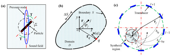 For simplicity, here we only consider the two-dimensional (2D) domain problem and it is convenient to extend our method to the three-dimensional (3D) case. In a fluid medium without any body forces (Figure 1b), the acoustic pressure within an arbitrarily shaped domain is related to the pressure and velocity on the boundary as described by Kirchhoff–Helmholtz integral equation [54]. Discretizing the boundary into elements, the pressure at any location within can be given by