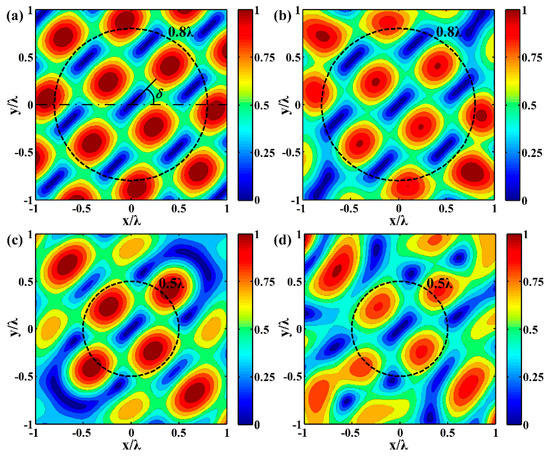 Figure 2b–d show the synthesized acoustic field within different regions, in which the pressure amplitude has been normalized. The blue color indicates the pressure minima and the red one represents the maxima. The pressure field shown in Figure 2b is derived with the truncation order and employing thirteen transducers. The same number of control points is equally distributed along a circle with radius indicated by the dashed line. Although the truncated error is unavoidable, the pressure distribution within the circular control region is identical to the desired pressure field in Figure 2a. The elongated pressure node is formed and surrounded by four anti-nodes, which can produce a strong force gradient to trap the target. However, the co-existing of pressure nodes within the field limits its selectivity.