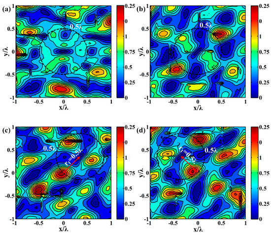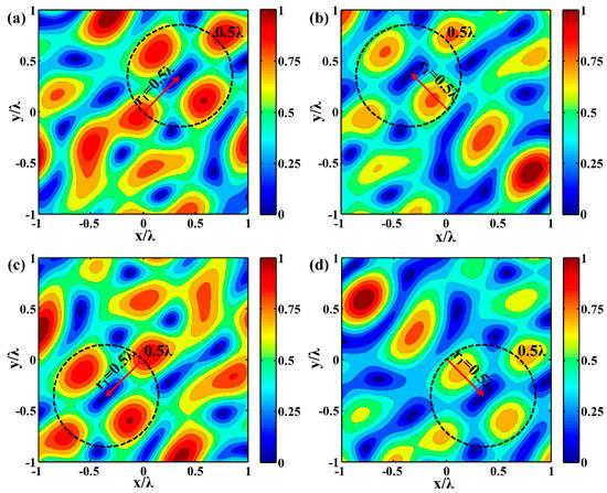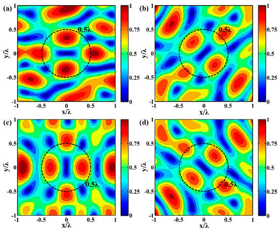 Anticlockwise rotation of the synthesized pressure field from to with interval: (a) ; (b) ; (c) ; (d) .