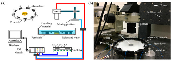 Figure 5 shows the schematic diagram of our experimental setup. Nine lead zirconate titanate (PZT) transducers (Baoding Yitian Ultrasonic Technology Corporation, Baoding, China) are homogenously mounted on a circular pedestal to generate the desired sound field within a circular region (radius = ). The plastic pedestal with radius 88.8 mm is placed at the center of the Petri dish that is filled with deionized water. The center frequency of the PZT transducers is 2 MHz, while the width, height and thickness are 20 mm, 10 mm, and 5 mm, respectively. To minimize the reflected wave, each transducer is designed with an epoxy matching layer on the front surface and a tungsten-loaded absorbing backing layer. Without vertical force to balance the gravity, the particle will sink to bottom where the sound intensity is much lower. To solve this problem, the center bottom of the pedestal is covered by agar with 5 mm thickness. The agar has very similar acoustic properties to water and will not disturb the synthesized sound field [56]. Continuous sinusoidal voltage that is generated by the multichannel function generator (homemade PXI platform using FPGA) is amplified by the power amplifiers and then applied to the transducers. The amplitude and phase of each driving signal can be independently modulated with a computer. A visual recording system composed of a CCD camera (GCO-260202, Daheng Imaging, Hangzhou, China), an image acquisition card and a motion platform is used to record the micro-particle position. The actual apparatus is shown in Figure 5b and the related acoustic parameters are listed in Table 1.