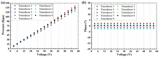 Synthesizing the sound field requires accordingly modulating the amplitudes and phases of incident waves. Due to the fabrication inconsistency, the generated acoustic pressure of each transducer is calibrated at the pedestal center by using a needle hydrophone (1376, Precision Acoustics, Ltd., Dorchester, UK). To obtain the phase differences, a synchronous signal that is triggered by the transducer driving voltage is used as the reference. Both the pressure and reference signals are sampled simultaneously by a multichannel data acquisition card with 100 MHz sampling rate. Figure 6 shows the measured pressure and the phase of each transducer. In Figure 6a, the pressure variation under the same excitation voltage is clear and the value changes along with the increase of driving voltages. The measurements in Figure 6b are actually the phase difference between the measured pressure and the reference signal. The constant phase difference at various excitation voltages indicates that the performances of employed PZT transducers are stable and time-invariant. For individual transducer, the relation between the excitation voltage and pressure amplitude shows good linearity within the measuring range 0 V–57 V. In the following experiments, the maximum excitation voltage is selected to be 40 V and the calibrated voltages will be applied to the transducer array to obtain the required output pressures.