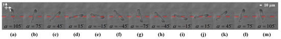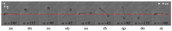 The rotation direction can be easily alternated by inverting the adjustment of the transducer excitation. As shown in Figure 11a–g, the rod with an initial angular position of is driven to rotate clockwise with a interval angle. When a half-cycle rotation is performed, the sequence of transducer excitation is inverted. Correspondingly, the rod rotates back to its initial position with the same interval (Figure 11g–m). In addition, the measured angular positions of the particle together with the theoretical value predicted from the field orientation are depicted in Figure 12. The maximal angular deviation is also about .