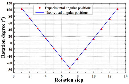 Figure 10 shows the detailed rotation process with a smaller angle interval , in which the measured angular positions are extracted from a series of captured photos. The corresponding theoretical angular position of the synthesized pressure node is also illustrated by the solid line for comparison. Due to the maximal angular deviation about , the resolution of the prototype rotation device is .