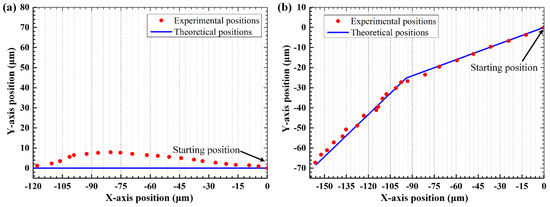 Transportation of the silica rod to an appointed position along arbitrary trajectory can also be achieved within the same device. This may be of help in the application of medicine tests and micro-assembly, where the drugs or components usually needed to be orientated and then shifted to a specific position. Figure 13 shows the process of two dimensional transportation along different paths. In Figure 13a, the particle is moved by 125 μm along the negative direction of x-axis. During the transporting process, the rod firmly maintains its orientation. Figure 13b shows another trajectory, where the particle is first transported along the direction of , and then changed to the direction of . The first segment distance is about 98 μm and the second one is about 75 μm. The center positions of the silica rod in each moving step along with the theoretical trajectories of the synthesized pressure node are illustrated in Figure 14. In general, there is a good agreement between the actual positions and the predictions. The deviation may be caused by the same factors as mentioned in rotation process. But, for the transporting process, only the phase of each transducer is modulated, which greatly reduces the influence of transducer inconstancy and may improve the manipulation accuracy. Correspondingly, the maximal deviation of the particle center is within 8 μm, smaller than that in rotation process. With appropriate phase modulation, the rod-shaped particle can be transported to any location within the controllable sound field, while keeping its orientation. If the combinations of amplitude and phase modulation are further applied to the transducers, more complicated manipulation, such as performing the rotation and the transportation simultaneously, can be achieved.