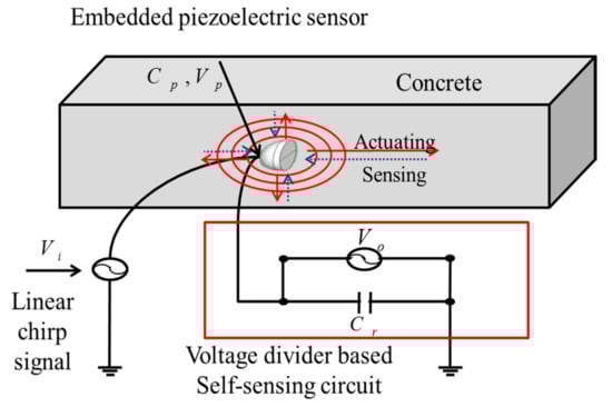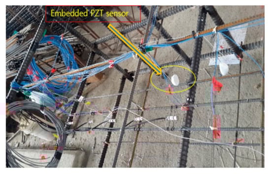 Piezoelectric materials can convert the mechanical energy into electric signals and vice versa [,]. Thus, PZT materials can be used and embedded in concrete to induce and detect wave propagation and vibrations [,,,]. Through different approaches, the piezoelectric sensors can use to estimate the strength of concrete. By creating ultrasonic waves and observe the dynamic effects of the structure to these waves to analyze the EMI of excitation [,]. The ultrasonic wave response and EMI can be acquired due to the unique properties of PZT [].