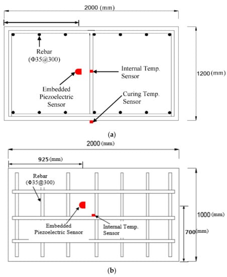The experimental setup was prepared before casting concrete. After pouring concrete, data were acquired by a single PZT sensor in each specimen; these sensors were already embedded in the specimens before casting concrete. Using the sensors embedded in the concrete specimens, the dynamic responses of the structures to the ultrasonic waves and vibrations created by actuators were measured every hour for 28 days. At the same time, the internal temperature of the concrete was measured. The specimens were also simultaneously examined via compressive strength testing using cylinder cores taken from the main concrete at 1st, 3rd, 7th 14th, and 28th days. Figure 4 shows some details of the sensor placement, spacing, and arrangement, which were set up before casting concrete.