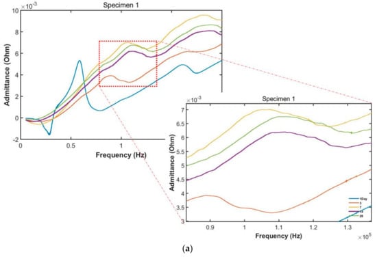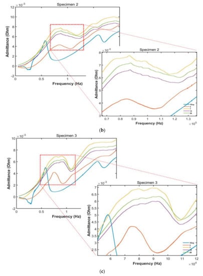 Figure 5a–c show the data measured by sensors for three specimens. The data shown is for the 1st, 3rd, 7th, 14th, and 28th days. The resonant frequency is proportional to the stiffness of the concrete []. Thus, the velocity is observed to increase with longer curing times. We also observed that the velocity changes frequently during the earlier stages of curing.