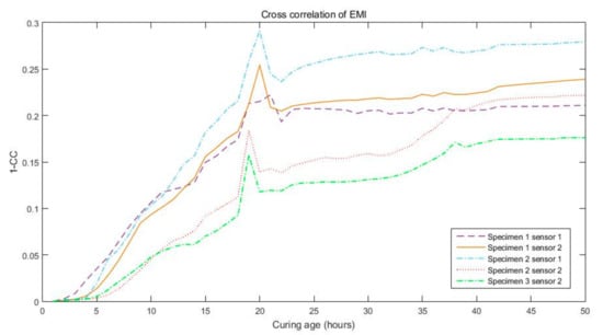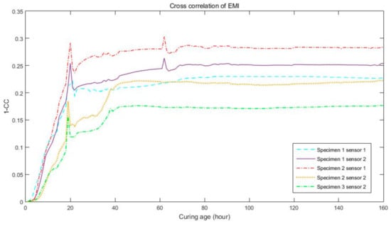 These data were measured in specimens after cast concrete was aged for between one hour and 28 days. The Figure 6 and Figure 7 shown below depict the cross correlation of impedance data for five different channels over a curing time of 48 h. It can be seen that the amplitude is almost zero after the first hour. After that, until the 18th hour of aging, the amplitude changes and grows rapidly. This indicates a rapid change in the strength behavior. After the 20th hour, the amplitude’s rate of change becomes slower.