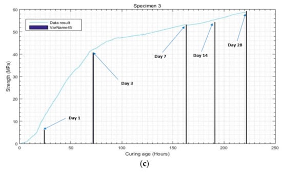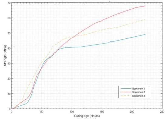 Similarly, the results for specimen 3 are presented by dashed line in Figure 8. Here, the data indicate that the strength development was started in the initial ages, between the first and second hours; this had been happened because this specimen was placed at a temperature of 40 °C. The graph further shows that the strength development was fairly slow until the eighth or 10th hours; after 10 h the strength was observed to rise a bit faster until the end of the first day. On the second day, the strength grew faster until the 45th or 46th hour of curing, and then on the third day it was observed to be slower when compared to the second day (but still rapid). After the 115th hour, it became constant and the strength development growth was slower until the 28th day of curing.