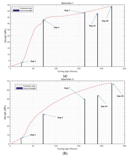 In Figure 9a, specimen 1 shows matching actual and predicted compressive strength results on the first day; both of the values were 3.4 MPa. After that, the actual strength on the third day (38.2 MPa) was higher than the predicted strength (37.1 MPa); this difference may be due to signal fluctuation. Similarly, the predicted and actual strengths on the seventh day were very similar; after slight variation, they were observed to almost match at the end of the 28th day. This plot shows 92% similarity between the strength development patterns of the actual and forecasted compressive strengths of concrete.