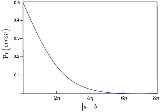 The scalar reconciliation applied on the two-way CVQKD protocol resulted in approximately 160 km of achievable transmission distance (for the computations of the secret key rate, and the detection parameters, see the derivations of [,,]). The results indicate that the range of the current two-way CVQKD without our post-processing technique can be significantly extended, and the maximal 80.5 km range of the current one-way CVQKD systems [] can be doubled, and almost tripled compared with existing two-way CVQKD systems [,]. The reason behind the phenomenon is the possibility of the conversion of the Gaussian quantum channel to a logical binary Gaussian channel, similar to the multidimensional reconciliation approaches developed for one-way CVQKD.