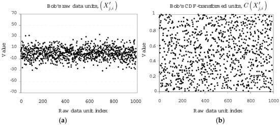 (a) The distribution of Alice’s raw data units. The units follow Gaussian random distribution; (b) The distribution of the Cumulative Distribution Function (CDF)-transformed units. The probability distribution has changed into uniform in the range of .