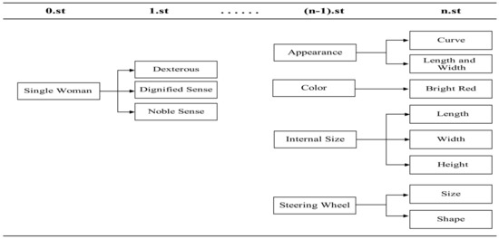 Such scope classification means that while designing new digital factors, the basic components of digital are decomposed into concepts of stratum and these concepts are broken down by the digital sensibility degrees into a tree structure to obtain the details of the design. Starting from Stratum-0, it gradually breaks down into clear and meaningful sub-concepts like Stratum-1, Stratum-2…, Stratum-N, until we obtain a description of the detailed design. Horiguchi and Suetomi argued that the purpose of the development of AE is to meet consumers’ demand through sensible psychology [7]; sensibility analysis law could clarify consumer’s fuzzy demands. Horiguchi applied AE to vehicle development. We could see the applications of AE from the development of the new car “Miyata” by Mazda Motor Corporation. From the start point of the design and the Miyata’s development, Stratum-0 was decomposed into four sub-concepts: sense of intimacy, sense of control, sense of speed, and sense of communication. The sense of intimacy refers to the close collocation with the car body and the proper size of internal space; the research and design team set an appropriate length for the car with this sub-concept in mind. If the team cannot obtain the details about the design, they will use this method to break it down until they obtain detailed quantitative, grouping, and modularized details for the design. Taking the development of a new sports car for female singles, as an example, as Figure 1 shows, the design’s initial concept begins from Stratum-0 in the classification of AE (Figure 1). In the next stage, we want to discuss the factors that constitute a female single. These may be sub-concepts, such as small, exquisite, dignified, and noble, which are the first stratum in the classification. The sub-concepts will continue being decomposed into many items.