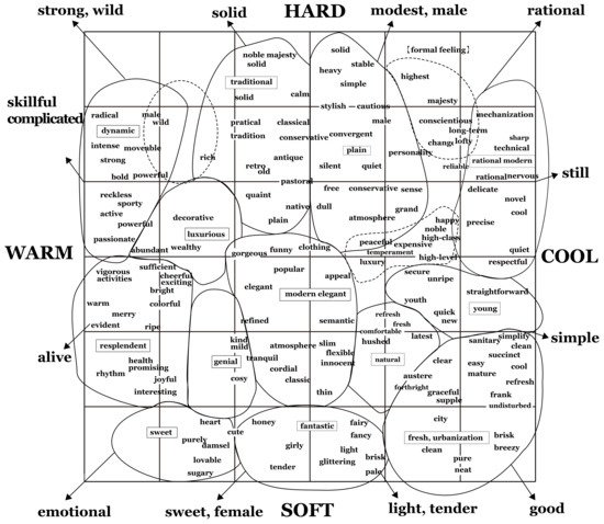 First, the selected enterprise’s targeted digital and took coffee cup sets in the design and development as selected digital samples of image words in the design case. Market research personnel in the company collected the form samples of target digitals of related image for the selection of image words. Affective engineering methods were used to select adjective words for correlation, and digital adjective words were divided into Design Image Scale Analysis (DISA) for different scopes of attribution by correlation degree (Figure 6). Then, the company designers and design researchers selected 80 sets of adjective words that described the target coffee cups in the research from closed-model interview-administered questionnaires. Furthered to encode the 80 sets of adjective words and produced them to be in the form of SD questionnaire. The factors in their consideration of buying coffee cups and the correlations of adjective words will be judged and selected by chosen design and development personnel in the company and by consumers. Those surveyed had to fill in a questionnaire according to their subjective preferences [25,26].