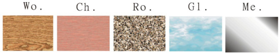 The first stage of the investigation in the development case was the image words investigation of coffee cups in the markets to obtain image words that were suitable for the research. In the digitals, 20 sets of coffee cup texture properties in markets were screened and coded. These were reproduced into close and open models for two-stage SD questionnaires. Customers would choose the degree of correlation for expected generated adjective words when they bought coffee cups. In the order of customer selection time, the texture factors that had significant differences between texture semantics were wood texture T1, pottery texture T2, stone texture T3, glass texture T4, and stainless steel texture T5. Actual samples were used to express texture factors Wo, Ch, Ro, Gl, and Me. The property words of five digitals were expressed as a set of values for an image word set function that included five related elements. For the texture part of the computer image handling, we used computer graphic pattern to demonstrate samples and a related software materials database or graphic database like shared material databases, such as Alias, MAYA, and three-dimensional (3D) max, as Figure 7 shows, and established a material database for the digital solid model design in the post engineering stage. (Figure 7).