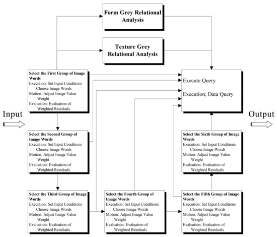 In the experiment we set X and x as for the texture factor domain and the continuous quantity of coupling degree between the form factor domain (Table 1), and image words were expressed as , as Table 2 shows; please refer to the contents of this experiment. According to the setting of the significance value of the grey correlation analysis, evaluate and assume , then compute the grey correlation analysis.