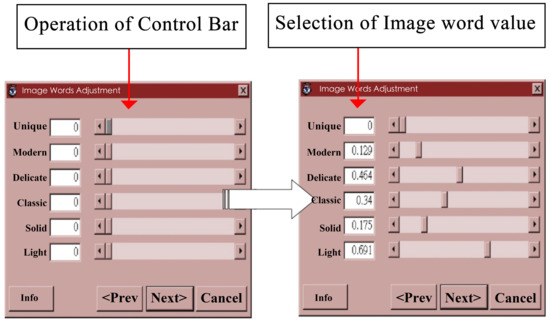 Citing the idea of system engineering science theory, which is the academic basis of this technical report, we inferred Equation (9), and applied it to the analysis value query model about the absolute word grey system sequence. The operation method is to move the control bar to control the necessary image word weight (Figure 9, Figure 10, Figure 11 and Figure 12). In setting the image word, we could input a group or several groups of image word weights, as shown in Figure 13 [30]. The out value is used in the program to implement the grey relationship coefficient operation and compute the weighted residual assessment to obtain the value nearest to the expectation value set by the grey relationship [31]. Assume the weighted residual formula as follows:
