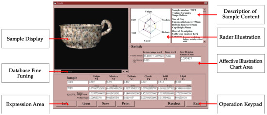 The presented data in the output of final consultation formula could be divided into five areas: sample display area, database micro-adjustment area, affective illustration chart display area, sample statistic numerical value area, and sample grey relation operation numerical value area (Figure 14 and Figure 15).