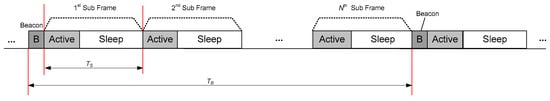 The beacon packet is generated from PC and it is disseminated to all nodes in Beacon frame with relatively long term interval denoted as TB. As discussed in the previous paragraph, one beacon frame is followed by multiple frames in each TB as shown in Figure 1. Moreover, TS, which denotes the time duration of each subframe, has relatively short term value compared with TB. Each subframe is composed of an Active frame and a Sleep frame in which the RF transceiver should keep the wake-up condition and the sleep condition. Hence, TB could be considered as the duty cycle of the transceiver. Moreover, in Sleep frame, the PC and all nodes enter to the condition of deep sleep or standby status for energy conservation. Hence, all transmissions are basically absent during Sleep frame, but we allowed for an exception in the case of emergency data transmission.