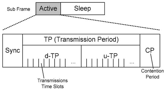 Figure 1 illustrates the overall structure of the MAC protocol which we proposed in this paper. The superframe is composed of a Beacon frame and multiple subframes, and each subframe is combined with an Active frame and a Sleep frame. Furthermore, each Active frame at every subframe is composed of several periods; Sync, Transmission Period (TP), and Contention Period (CP) as shown in Figure 2. TP in the Active frame is composed of both d-TP and u-TP; d-TP denoted for downlink directional transmission period from a PC to an individual node, and u-TP denoted for uplink transmission.