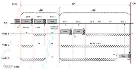 For the next step, u-TP is also divided into multiple time slots as shown in Figure 2, and all slots are fairly assigned for all nodes. In this period, all nodes do not have to keep a wake-up state. The node only wakes up if it has data to send to the PC. After a node finds the schedule of d-TP from the Sync packet reception, it accesses the assigned d-TP slots and transmits data. If a node cannot complete the transmission during the assigned time slots, it can continue to transmit the remaining data during CP using the competition approach. Moreover, the PC always wakes up during overall u-TP for successful reception.