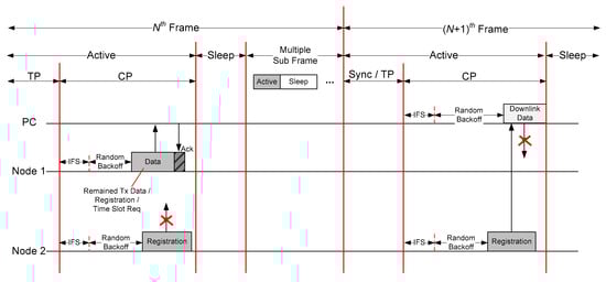 All transmissions in CP can be classified into the remaining data, emergency data, and specific control frames such as registration and u-TP slot request. If a node or some nodes did not complete data transmission during the assigned u-TP, they can additionally continue to transmit it in this period with competition based on CSMA/CA, so this period can be alternatively used with TP. Furthermore, if a node tries to register at the given network or changes its slot, it can also try to request to the PC via this period.