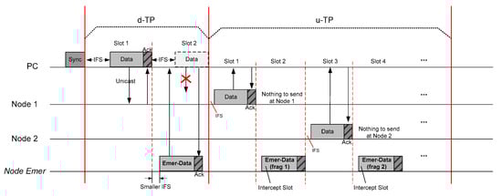 Even though TP (including d-TP and u-TP) and CP are existed for normal data and special control packet transmissions, the emergency data can be concurrently transmitted with high priority with maintaining normal data transmission function. The only weak point is that a node consecutively transmits massive emergency data. However, this situation could be easily addressed by conducting fragmentation if the required time is greater than a time slot, as shown in the right side of Figure 5. Furthermore, we considered that PC should accept an emergency data from a node even though it was not registered to PC before.