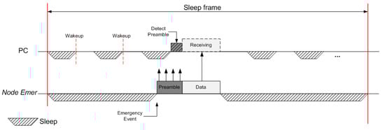 As a result, since the length of Sleep frame is initially configured, PC performs duty cycle based on LPL mechanism, and nodes just constantly sleep in this period if they don’t have emergency data transmission. If a node has emergency data to be transmitted, it just sends data with a long preamble signal.