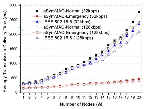 Figure 7 shows the results of average latency according to the number of nodes where they have same traffic. In this case, we fixed the traffic amount from all nodes as 1 packet/s per node and increased the number of the node to verify the latency of normal data transmission. Figure 8 shows the average latency from all nodes according to the variable traffic. Even though the latency of normal data transmission could not show the enhanced latency compared with IEEE 802.15.6, it could not say that the proposed MAC has more weakness because the amount of differentiation is too small and this could be changed by adjusting the parameters related to time schedule. Moreover, we could find that aSymMAC showed better performance than IEEE 802.15.6 beyond 0.4 of traffic interval in Figure 8. Therefore, the proposed scheme would show enhanced latency at high traffic environment.