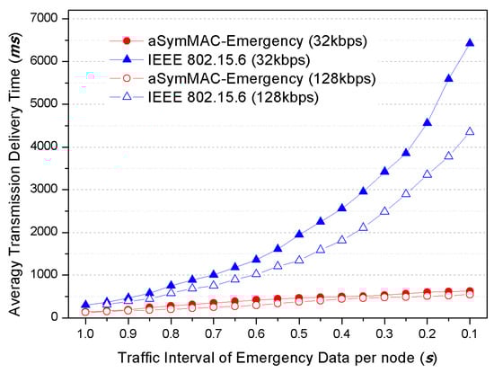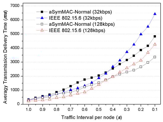 To consider the different speed on the PHY layer, we simulate 128 kbps and 32 kbps of transmission rates and present the results in Figure 7 and Figure 8. Both results similarly show the pattern of differentiation of delivery time on IEEE 802.15.6 and normal transmission on the proposed scheme; higher transmission rate induces lower delivery time. However, it cannot easily say that the differentiation of two transmission rates is high, because both mechanisms are depending on slot assignment structure. Meanwhile, in high traffic environment, high transmission rate can mitigate congested competition during contention period (RAP in IEEE 802.15.6 and CP in aSymMAC). Moreover, this condition can provide more opportunities to transmit normal data during contention-less period (Type I/II in IEEE 802.15.6 and u-TP in aSymMAC). Hence, Figure 8 shows the higher differentiation results of both protocols in high traffic environment.