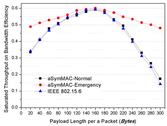 In the results of IEEE 802.15.6 and normal data transmission of aSymMAC in Figure 10, both protocols similarly present that less payload length makes lower bandwidth efficiency due to the heavy overhead; header and Ack mechanism are commonly applied even if data payload is too small. On the other side, we can see that the excessive payload length makes worse performance caused by that too larger payload length overflows assigned time slot and aggravates competition on contention period. Moreover, this can make more collisions. Meanwhile, the case of emergency transmission on aSymMAC shows better performance because every emergency transmission can preliminarily preempt the channel regardless of slot assignment.